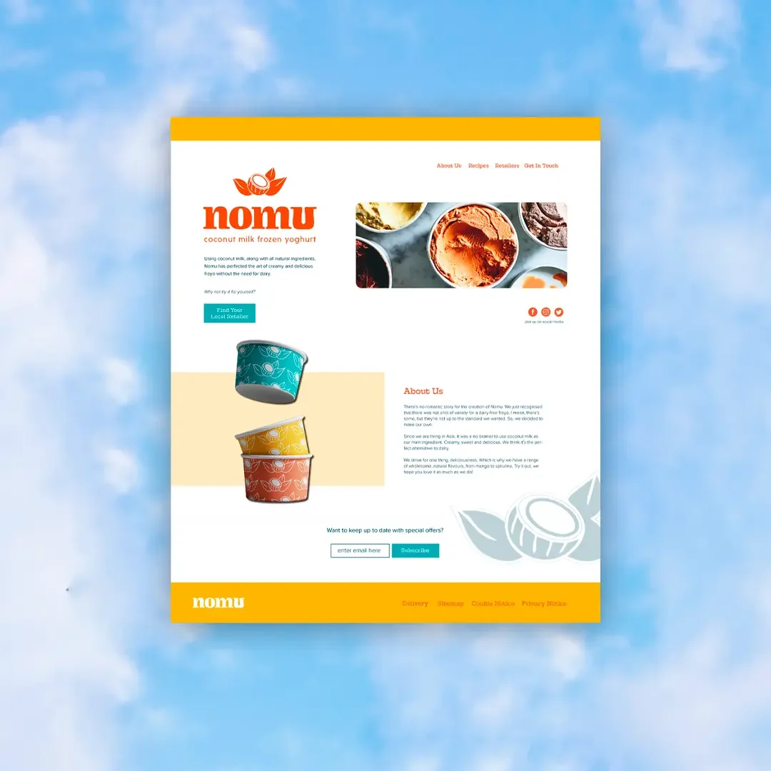 I developed a vibrant visual identity for Nomu (no-moo)- including a custom logo, colourful pattern system, froyo packaging design, brand guidelines, and a landing page. The logo mark reflects Nomu’s key differentiator - its creamy, dairy-free coconut milk base.