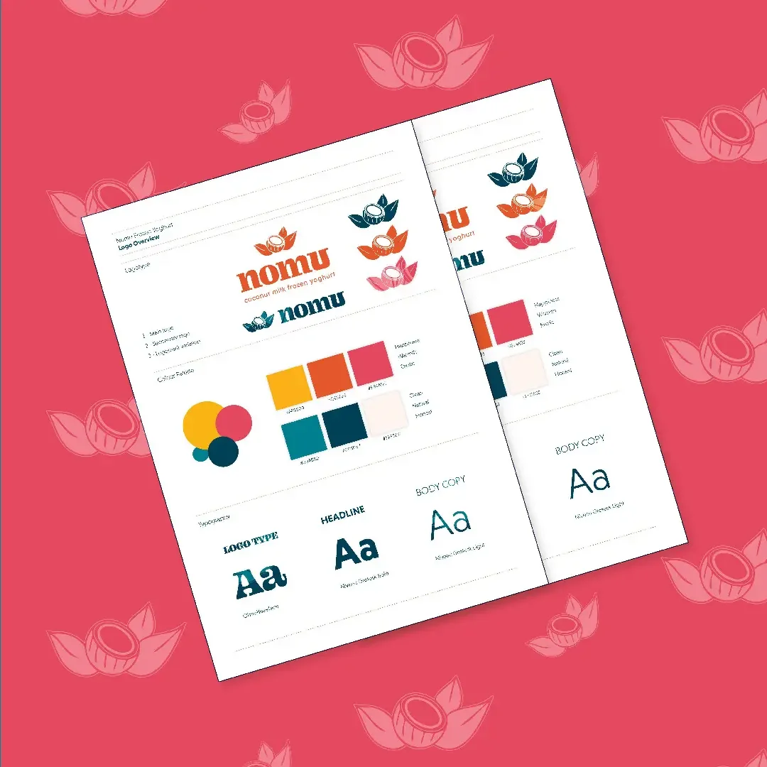 I developed a vibrant visual identity for Nomu (no-moo)- including a custom logo, colourful pattern system, froyo packaging design, brand guidelines, and a landing page. The logo mark reflects Nomu’s key differentiator - its creamy, dairy-free coconut milk base.